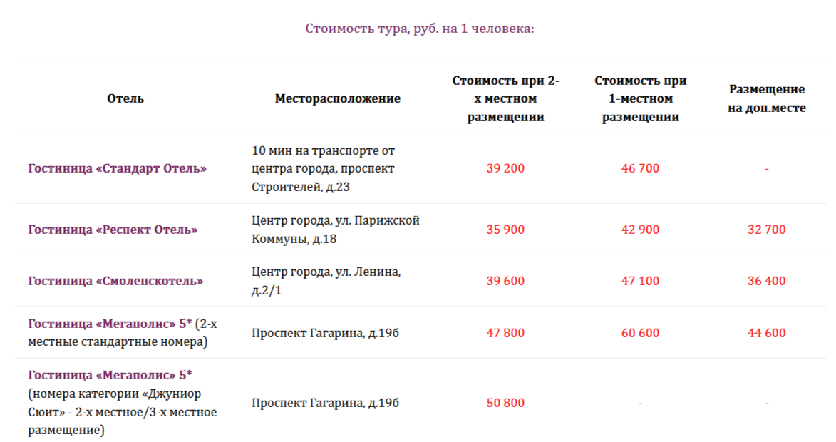 *Дополнительные места: гостиница «Смоленскотель» / «Респект Отель» – евро раскладушка; гостиница «Мегаполис» — евро раскладушка.