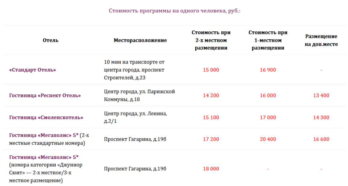 ** интерактивной программой «Чаепитие с Василием Теркиным» состоится при составе группы от 10 человек. *** В случае отсутствия туристов из г. Санкт-Петербург, прибывающих поездом, экскурсии начинается с момента встречи гостей на ж/д. Размещение туристов осуществляется после экскурсий. Порядок предоставления экскурсий может меняться при соблюдении объёма предоставляемых услуг. Рекомендуемые поезда: Санкт-Петербург — Смоленск, поезд 087А (отправление в 21:09, прибытие В Смоленск в 12:48) Москва – Смоленск, поезд «Ласточка» 715М (отправление в 07:15, прибытие в г. Смоленск в 11:17) Смоленск – Москва, поезд «Ласточка» 732М (отправление в 18:40, прибытие в Москву в 22:45) Туристы из Санкт-Петербурга в день окончания тура могут доехать до Санкт-Петербурга: 19:00 Прямой автобус Смоленск — Санкт-Петербург (компания «Эколайнс»), прибытие в Санкт-Петербург в 06:00 Железнодорожным транспортом с пересадками: